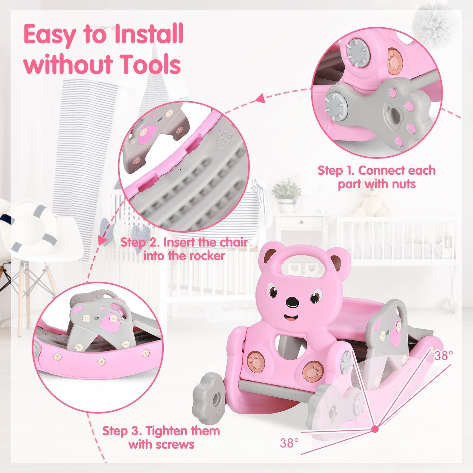 ● 4-in-1 design with the game of sliding swinging basketball and ring-toss ● The detachable seat can be used independently ● Multiple games help to develop kids’ brain and limbs ability ● 38°forward and backward swing amplitude safe enough without falling ● Stable structure with a large bearing capacity of 132 lbs ● A smooth surface makes it convenient to clean with a wet cloth ● Safe HDPE material makes it non-toxic and odorless ● Easy to assemble within minutes
